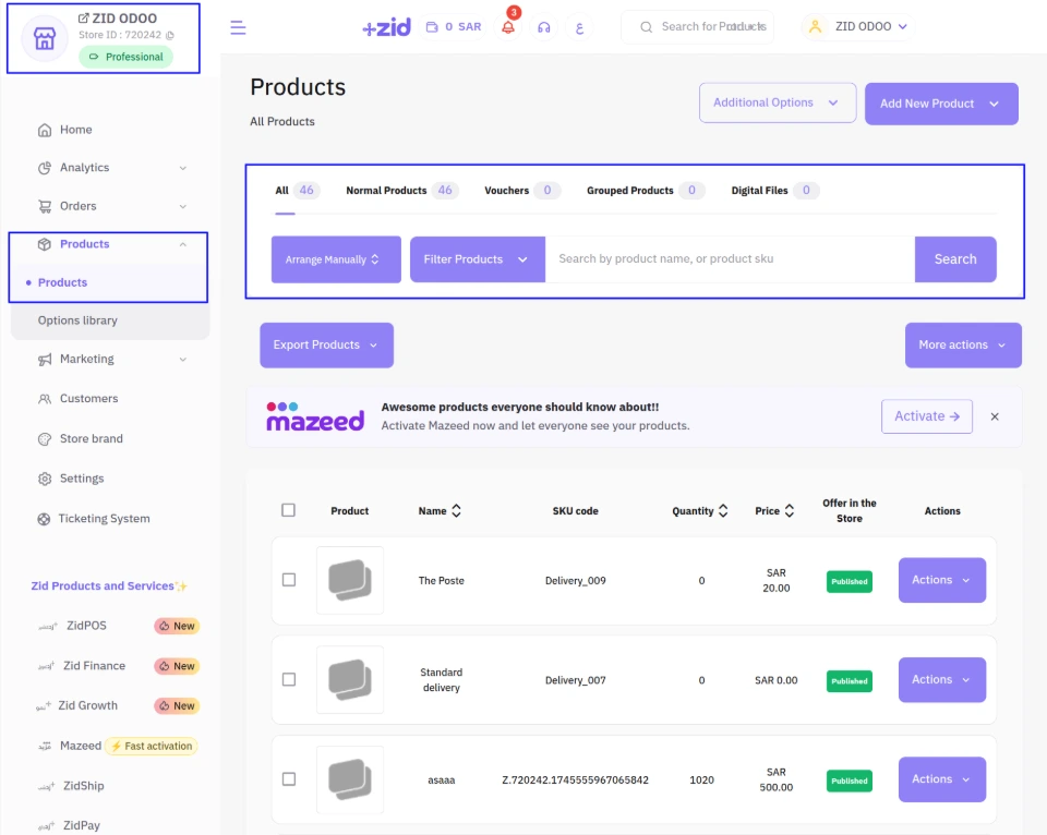 Users can view the synced products along with their ZID ID and ZID Store Name after importing from ZID to Odoo.